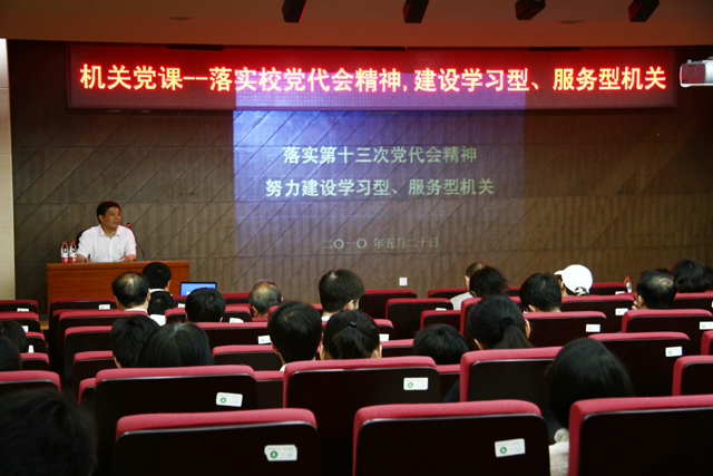 5月21日,校黨委副書記侯光明在圖書館報(bào)告廳為機(jī)關(guān)黨員講了一堂題為《落實(shí)第十三次黨代會(huì)精神 努力建設(shè)學(xué)習(xí)型、服務(wù)型機(jī)關(guān)》的黨課,機(jī)關(guān)各黨支部120余名黨員參加,會(huì)議由機(jī)關(guān)黨委書記楊惠萍主持。這是進(jìn)一步深入宣傳校第十三次黨代會(huì)精神,在機(jī)關(guān)黨委所轄各黨支部率先開展?fàn)巹?chuàng)學(xué)習(xí)型黨組織活動(dòng)的具體舉措。