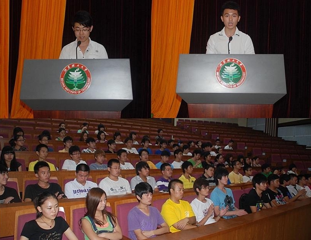 大二優(yōu)秀學(xué)生代表張丁爽同學(xué)用事實回答了同學(xué)們?nèi)绾味冗^大學(xué)生活的例子,為同學(xué)們提供了學(xué)習的榜樣。2010年新生代表安云朝同學(xué)在發(fā)言中描述了自己入學(xué)的心情,表示一定再接再厲,充分利用學(xué)校的教學(xué)和生活條件,努力學(xué)習,成為一個具有國際視野的高素質(zhì)人才。