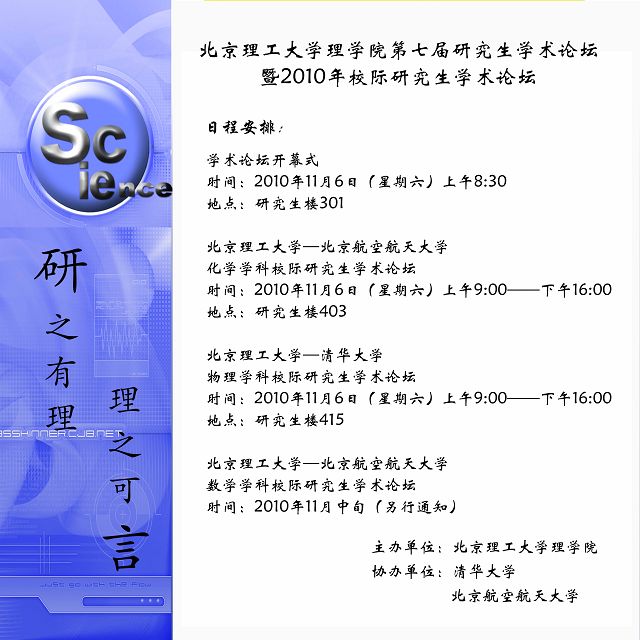 附:北京理工大學(xué)理學(xué)院第七屆研究生學(xué)術(shù)論壇暨2010年校際研究生學(xué)術(shù)論壇日程安排