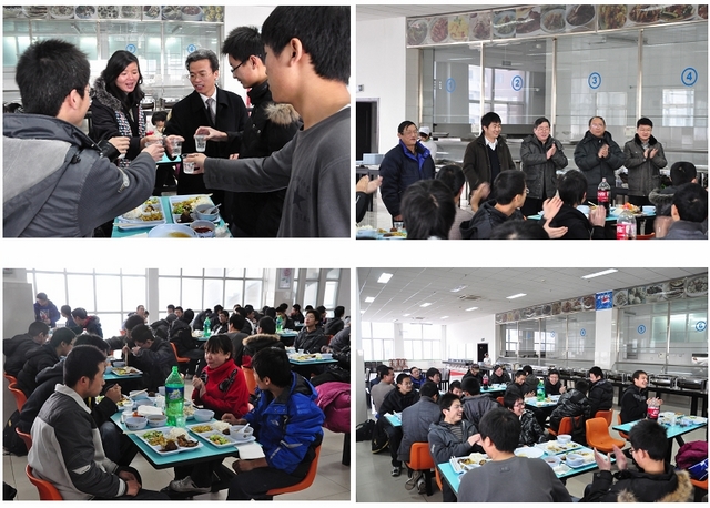 12月30日,良鄉(xiāng)校區(qū)南食堂二層張燈結彩,一派歡樂祥和的節(jié)日氣氛。機械與車輛學院常務副院長唐水源、副書記副院長閻艷、制造工程系馬術元、王西彬、張衛(wèi)民、薛慶、劉檢華、肖定國、胡耀光、潘勤學等老師們帶著對2010級新生的祝福和問候,不辭辛勞、冒著冬日的嚴寒赴良鄉(xiāng)校區(qū)看望學生,表達對學生的關心和期望,把濃濃的暖意帶到2010級新生心里。吃餃子是中國人過年的象征。老師與學生們一起吃餃子、聊家常,其樂融融。大家舉杯同飲,老師們祝同學們新年快樂、學業(yè)進步、闔家歡樂?,F場響起了熱烈的掌聲。