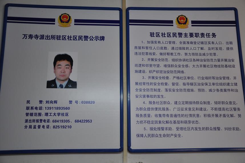 北京市公安局為了貫徹十七屆五中全會精神,提出建立社區(qū)民警住社區(qū)工作制的意見,2011年元旦,萬壽寺派出所、學(xué)校保衛(wèi)處和居民委員會的領(lǐng)導(dǎo)共同為“理工大學(xué)社區(qū)”警務(wù)工作站進(jìn)行了揭牌,“理工大學(xué)社區(qū)”警務(wù)工作站正式投入了使用。