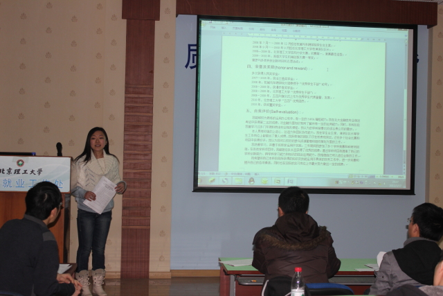 活動(dòng)以學(xué)生演講、介紹自己及自己的簡(jiǎn)歷,然后老師和同學(xué)共同點(diǎn)評(píng)的方式進(jìn)行?;顒?dòng)之初,劉老師拋磚引玉,讓同學(xué)們進(jìn)行自我思考,“我為什么要這份工作”、“公司為什么選我”以及“我能為公司創(chuàng)造什么”。還有,公司在瀏覽簡(jiǎn)歷的同時(shí),也很重視內(nèi)涵。老師認(rèn)真地聽(tīng)每一位同學(xué)的演講,從內(nèi)容到排版、從格式到文字,劉老師都給出了很中肯的建議,同學(xué)之間的互動(dòng)也很活躍,現(xiàn)場(chǎng)的氣氛十分和諧。