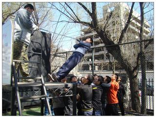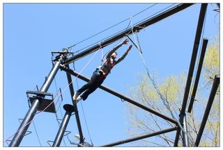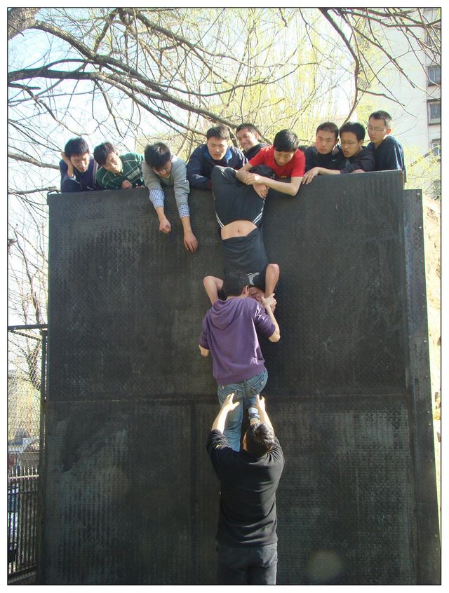 接下來的活動主要分為四個部分,信任背摔、高空抓桿、驚險排雷和海盜船逃生。信任背摔主要考驗的是團隊成員之間的互相信任,當背摔的同學向后躺下去的一瞬間,是把自己的生命交給了隊友,這是需要百分之百的信任才可以做到的。高空抓桿主要培養(yǎng)的是學員挑戰(zhàn)自我的勇氣,同時也有對負責保護其安全的同學的充分信任。驚險排雷訓練的是大家面對困境時,團結(jié)一致,轉(zhuǎn)換思維,共同解決問題的能力。海盜船逃生要求學員在規(guī)定的時間內(nèi)不借助任何其他外來措施,成功將所有成員送達四米高的墻頂。這個項目是所有項目中最有挑戰(zhàn)性的一個,首先它需要同學做人墻,其次需要同學之間的協(xié)調(diào)配合,但最主要的是策略,尤其是最后一個人的成功抵達沒有團隊的協(xié)作,是幾乎不可能完成的,同學們進行各種嘗試,雖然過程中有失敗,但是最后還是很成功地完成了任務(wù),得到了教練的認可。