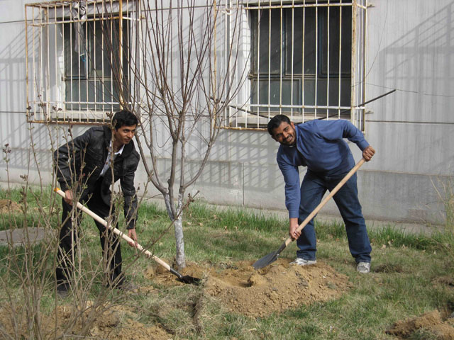 與此同時,中關(guān)村校區(qū)內(nèi),我校留學(xué)生也興致勃勃地投入到熱火朝天的植樹活動中,在留學(xué)生公寓周邊、在圖書館周邊、在軟件學(xué)院實驗樓周邊,師生們挖坑、扶苗、培土……顯得忙碌而有序。每栽一棵樹,他們都要用手扶正、用腳踩實,而且培好邊埂?;赝R排列的一棵棵樹苗在春風(fēng)中搖曳;想象著它們經(jīng)歷風(fēng)霜雪雨終將枝繁葉茂、覆庇一方,師生們的心樂開了花。大家紛紛和自己親手栽種的樹苗合影留念。最后,大家集體合影留念,同學(xué)們手中高舉院旗,歡呼雀躍。