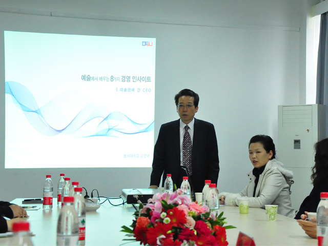 下午2點(diǎn),韓國東西大學(xué)的老師在中心教學(xué)樓1124會議室給學(xué)生帶來了精彩的學(xué)術(shù)講座。徐其敏副院長主持了講座,首先,金昌大院長介紹了藝術(shù)在企業(yè)、生活中的應(yīng)用。他提出了創(chuàng)造經(jīng)營的概念,分析了創(chuàng)造經(jīng)營與藝術(shù)的關(guān)系,并用實(shí)例給我們進(jìn)行了展示。他認(rèn)為洞察力和觀察力對于企業(yè)非常重要,獨(dú)特的創(chuàng)新思維是藝術(shù)家設(shè)計(jì)師的基本素質(zhì)。