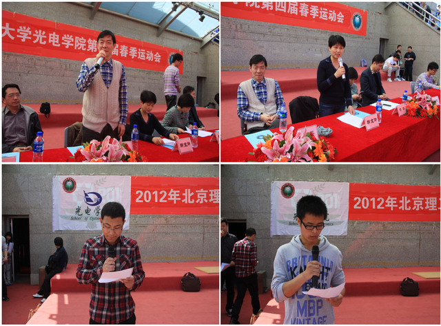 2012年4月12日下午13點,北京理工大學光電學院第四屆春季運動會在中關村校區(qū)東操場拉開序幕。出席此次開幕式的領導和老師有魏平院長、韓寶玲書記、郝群副院長、趙長明副院長、鄒銳副書記和王涌天教授。學院各機關部門及各研究所的老師們也一齊觀看了本次運動會的開幕儀式。參加本次運動會的有08、09級本科生,研一、研二碩士生,博士生以及學院的教職工隊伍等。