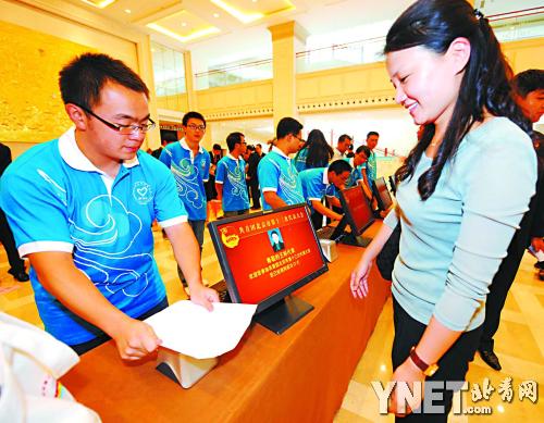 “請您出示報到通知!”在志愿者的引導下,一名代表將自己的報到通知交給了現(xiàn)場的志愿者,志愿者將通知上的條形碼對準報到處的電子簽到器一掃,代表的個人信息就出現(xiàn)在了報到處的電腦屏幕上。與此同時,與報到處10臺電腦相連的電子顯示屏上的報到數(shù)據(jù)也會立刻變化。隨著代表們陸續(xù)簽到,電子屏幕上的已報到人數(shù)和未報到人數(shù)也在滾動變化中。
