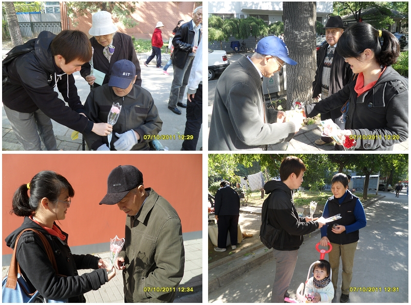 以此為契機(jī),2012年10月23日,人文學(xué)院開展了以“信仰·青春·陽光”為主題的重陽節(jié)關(guān)懷老人活動。2011-2012年度國家勵志獎學(xué)金和國家助學(xué)金的七名同學(xué)組成人文學(xué)院學(xué)生服務(wù)中隊中關(guān)村校區(qū)分隊,向校園里的老人發(fā)放賀卡和鮮花,表達(dá)我們作為大學(xué)生群體對老人的關(guān)懷之情。