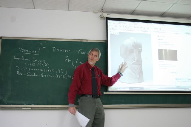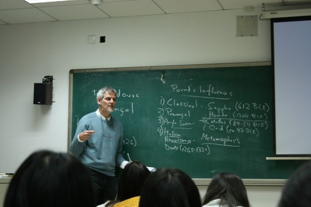 Gery教授在現(xiàn)代主義詩歌系列講座中重點(diǎn)講授了英語意象派詩歌。他系統(tǒng)介紹了20世紀(jì)上半頁美國新詩運(yùn)動(dòng)發(fā)展的情形,以獨(dú)特的視角對(duì)美國現(xiàn)代詩歌巨匠埃茲拉•龐德和T•S•艾略特的詩學(xué)進(jìn)行了深入的剖析,重點(diǎn)闡述了龐德的詩學(xué)對(duì)英美現(xiàn)代主義和后現(xiàn)代主義詩歌的影響。他認(rèn)為,龐德早期的意象主義詩歌和翻譯對(duì)美國新詩的發(fā)展產(chǎn)生了重大影響,龐德中后期的詩學(xué)(漩渦主義和象形文字法)和《詩章》對(duì)20世紀(jì)60年代以后的后現(xiàn)代主義詩歌(黑山派、語言詩派、紐約詩派、垮掉詩派等)產(chǎn)生了深遠(yuǎn)的影響。此外,Gery教授還詳細(xì)闡釋了龐德詩歌中的中國元素以及中國詩學(xué)和儒家哲學(xué)對(duì)龐德的人文思想和文學(xué)創(chuàng)作的重大影響。