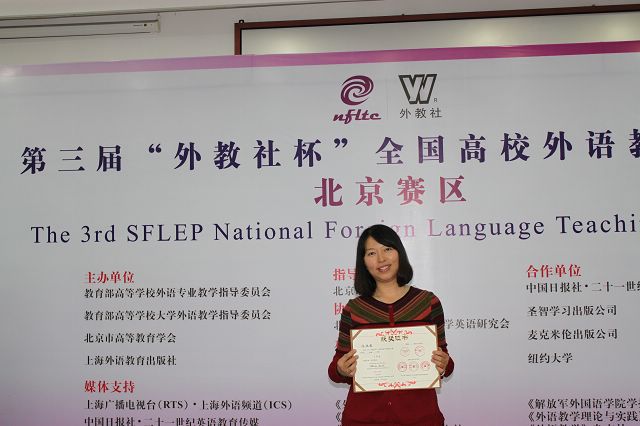 今年的“外教社杯”是針對(duì)英語(yǔ)專(zhuān)業(yè)的教師。 北京賽區(qū)有30多個(gè)學(xué)校報(bào)名參賽,經(jīng)過(guò)激烈的初賽, 即講課比賽, 只有12名選手進(jìn)入“說(shuō)課”階段的決賽。我院張艷霞老師成功進(jìn)軍決賽,以嫻熟的基本功和教學(xué)技巧以及充滿(mǎn)激情的課堂風(fēng)格贏得評(píng)委好評(píng),并獲得三等獎(jiǎng)的好成績(jī)。