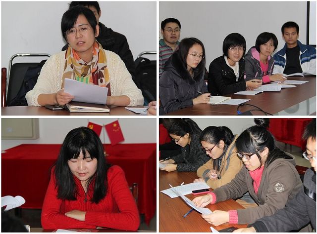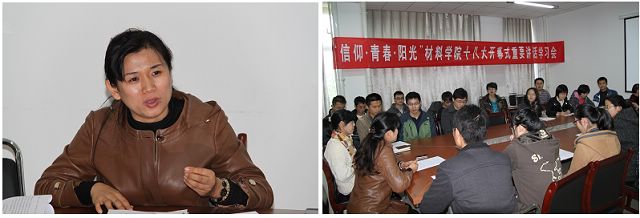 隨后劉艷老師主持學(xué)習(xí)活動(dòng)進(jìn)行,帶領(lǐng)入黨積極分子研讀了胡總書記的講話,并結(jié)合材料學(xué)院學(xué)生特點(diǎn)提出了相關(guān)要求。會(huì)場(chǎng)氣氛非?;钴S,同學(xué)們也都表示會(huì)持續(xù)關(guān)注十八大進(jìn)程,做好十八大精神的學(xué)習(xí)和傳播工作。