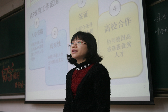 報(bào)告會(huì)上,德國(guó)駐華使館文化處留德人員審核部的曲彩虹女士針對(duì)中國(guó)高校交流學(xué)生以及留學(xué)生的入學(xué)資格、需準(zhǔn)備的相關(guān)材料以及需要參加的面試等具體情況做了詳細(xì)介紹。經(jīng)過她耐心細(xì)致的講解,同學(xué)們對(duì)于材料審核以及審核流程有了更深入的了解。