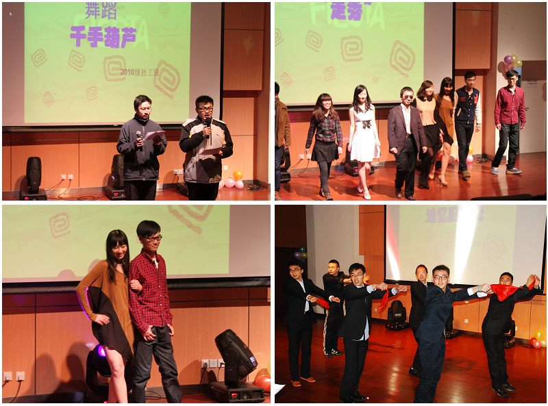 晚會(huì)期間不斷穿插的游戲與抽獎(jiǎng)的等互動(dòng)環(huán)節(jié),使同學(xué)們很好地融入了晚會(huì)。深情的獨(dú)唱《慢慢》、深秋歌手對(duì)唱《I love you》、充滿高難舞蹈技巧的《舞韻》、搞怪的《千手葫蘆》等為全院師生帶來(lái)了歡聲笑語(yǔ)。晚會(huì)中,輔導(dǎo)員王群超和孫碩加入到學(xué)生表演中,將現(xiàn)場(chǎng)氣氛推向高潮。晚會(huì)《rolling in the deep》歡快的氣氛下落下帷幕,現(xiàn)場(chǎng)一片歡樂(lè)祥和的氣氛。