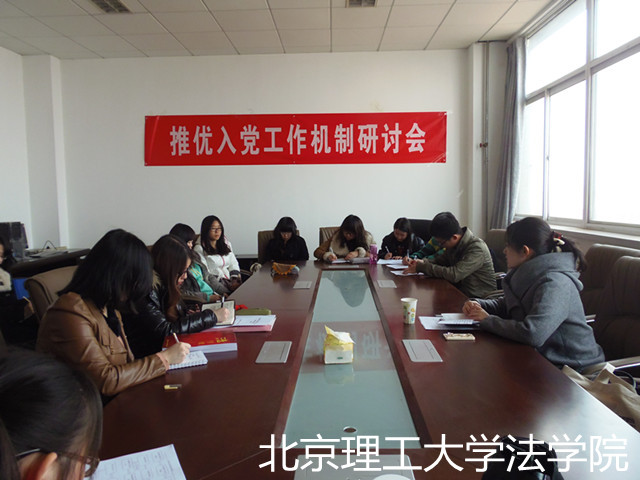 2013年3月21日,北京理工大學(xué)法學(xué)院召開(kāi)推優(yōu)入黨工作機(jī)制研討會(huì)。本次會(huì)議以學(xué)生推優(yōu)入黨工作研討為中心,全面布置了新學(xué)期學(xué)生黨建相關(guān)工作。參加本次會(huì)議的有法學(xué)院副書記副院長(zhǎng)張巍、法學(xué)院團(tuán)委書記聶寧寧和法學(xué)院良鄉(xiāng)校區(qū)各學(xué)生黨支部委員、各年級(jí)團(tuán)支部學(xué)生干部,2010級(jí)本科生黨支部書記羅月主持了會(huì)議。