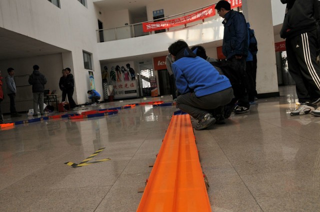 3月24日早上10點,北京理工大學方程式賽車俱樂部成員在良鄉(xiāng)校區(qū)學生服務(wù)中心進行緊張的賽道拼裝。11點,陸續(xù)有參賽選手前來進行試跑,從各位選手專業(yè)的裝備,飛馳的賽車中,我們知道,下午的比賽將異常激烈。