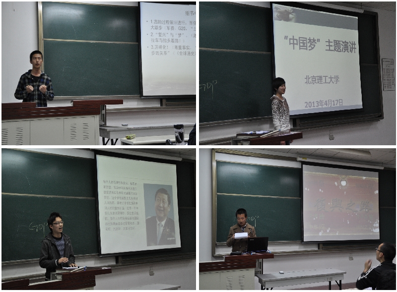 4月19日晚,北京理工大學(xué)基礎(chǔ)教育學(xué)院的同學(xué)在馬克思主義理論教研部老師的組織下,在良鄉(xiāng)校區(qū)理科教學(xué)樓104教室開展了“我的中國夢”主題演講活動。參加這次演講的同學(xué)共有14位,包括信息工程專業(yè)的王從奎、李驚春、劉天元、張麒、黃裕翔;自動化專業(yè)的馬志標(biāo)、于超、艾雪峰、鮑昱錕、高洲、禚惠玉、衛(wèi)云龍、魏鵬宇;工商管理專業(yè)的文思思。