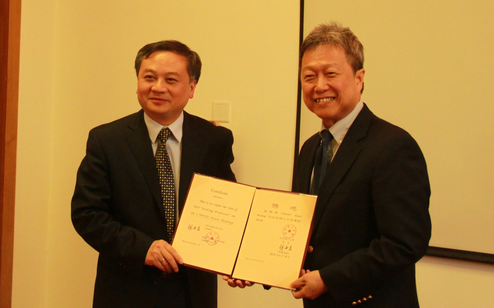 2013年4月22日下午,新加坡國立大學Chou Siaw Kiang兼職教授聘任儀式在主樓317會議室隆重舉行。管理與經濟學院院長魏一鳴教授,分黨委書記李金林教授,北京理工大學管理與經濟學院和新加坡國立大學部分教師代表參加了聘任儀式。管理與經濟學院副院長王兆華教授主持了兼職教授聘任儀式。