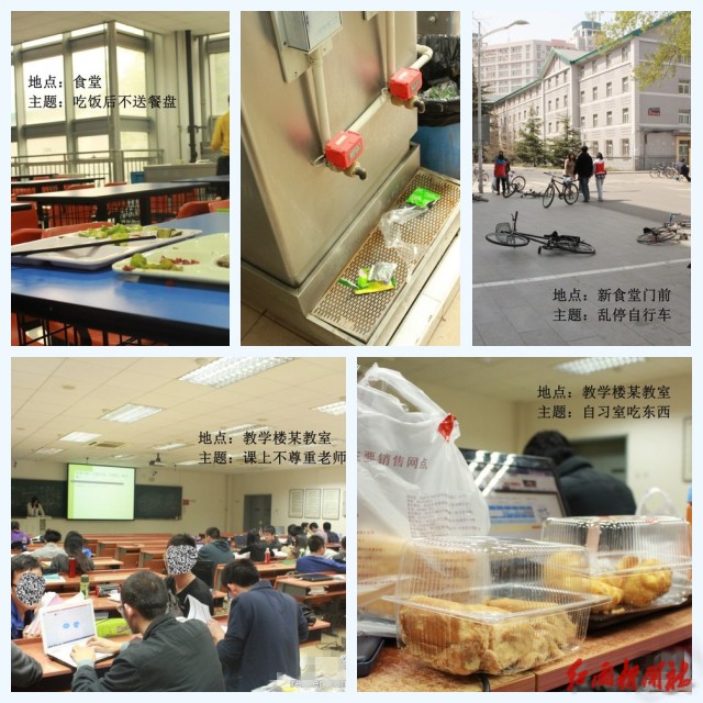 為舉辦反思文化展,信息與電子學(xué)院紅雨新聞社派出多路記者在校園中拍攝了多組照片,這些照片反映出發(fā)生在大學(xué)生身邊的不文明現(xiàn)象。一組組刺眼的照片上傳至官方微博、公共主頁和學(xué)生工作平臺后,引發(fā)了廣大同學(xué)對于維護校園文明、弘揚校園文化的熱烈討論。同學(xué)們紛紛留言轉(zhuǎn)發(fā),自我反省,有則改之,無則加勉。“反思”,把積極向上、充滿希望的正能量傳遞給每一個人。