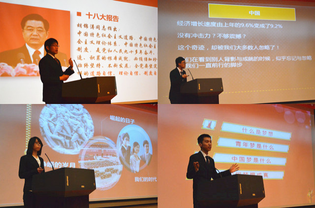 首先上場的是09級本科信息安全黨支部的王子實同學(xué),他用大量的案例生動地闡述了“從自信到自思”這一主題,思路清晰,論證充分,以獨特的視角分析了一個個值得我們深思的問題,告誡同學(xué)們遇事要自信地冷靜思考和獨立判斷。只有每個中國人都自信,中國才能自信。09級本科軟件工程二班黨支部的楊易寰同學(xué)同樣以“三個自信”為主題,通過國家應(yīng)對經(jīng)濟危機的舉措及近年的發(fā)展成就,反映出我們的制度和道路的正確性、先進(jìn)性和優(yōu)越性,詮釋了“三個自信”的內(nèi)涵,提醒大家在各種不良思潮的沖擊下,要明辨誤區(qū),正視中國。作為青年學(xué)子,要對國家、對自己胸懷自信,堅守前行。10級本科軟件工程二班黨支部的王詩雨同學(xué)以時間為線索,闡述了理想的力量這一主題。榜樣的力量是無窮的,在崢嶸的歲月里,他們的理想是建設(shè)新中國,在崛起的日子里,他們的理想是實現(xiàn)中華民族的偉大復(fù)興。而作為新時代的我們,則應(yīng)乘著理想的翅膀翱翔,搏擊長空,用奮斗留下無悔的青春回憶。最后上場的是12級碩士三班黨支部的任廣興同學(xué),他今天要為大家“解夢”。他的黨課主題鮮明,形式豐富,自始至終都非常注重與同學(xué)們的互動,帶領(lǐng)大家思考“什么是夢想”、“我的夢想”、“青年夢”與“中國夢”,一段頗有震撼力的視頻展示更是令人印象深刻。他指出,“中國夢”是“三部曲”的世紀(jì)夢,實現(xiàn)“中國夢”必須凝聚力量,做到“三個共享”。作為北理工軟件學(xué)子,我們應(yīng)沿著學(xué)校育人目標(biāo)和學(xué)院鍋爐房精神為我們指引的筑夢之路而努力,踐行我們自己的“中國夢”。