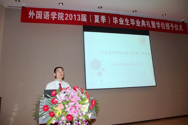 外國語學(xué)院常務(wù)副院長李京廉教授首先致辭。他首先向全體畢業(yè)生表達了祝賀,同時也對畢業(yè)生提出了殷切期望:希望他們勇于追逐自己的理想;做好自己的人生規(guī)劃;處理好各種人際關(guān)系,在即將踏入社會,這一所更大的課堂里汲取更多的營養(yǎng),不斷取得成功。