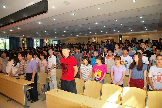 典禮伊始,嘹亮的國歌奏響,全體起立伴唱。