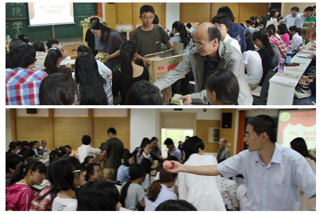 最后,伴隨著結(jié)束的音樂聲,學(xué)院為每一位新生帶來一份祝福、一份驚喜。書記、院長及所有到會老師將稻香村的月餅和紅富士的蘋果發(fā)到了新生的手中,濃濃的情意和溫馨的祝福讓所有的新生感覺到外國語學(xué)院這個(gè)大家庭的溫暖與情意。