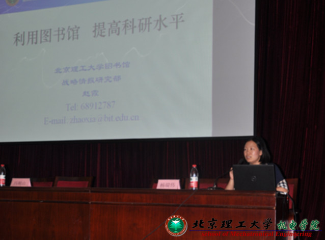 隨后,機電學(xué)院邀請到學(xué)校圖書館戰(zhàn)略情報研究部及機電學(xué)院學(xué)科館員趙霞老師為同學(xué)們作了“利用圖書館,提高科研水平”的報告。趙霞老師首先向同學(xué)們介紹了學(xué)校圖書館概況,然后又為同學(xué)們介紹了圖書館資源,以及如何利用圖書館資源查詢自己需要的科研資料。這些講解為同學(xué)們今后的文獻查詢、科研寫作的能力提高提供了幫助。