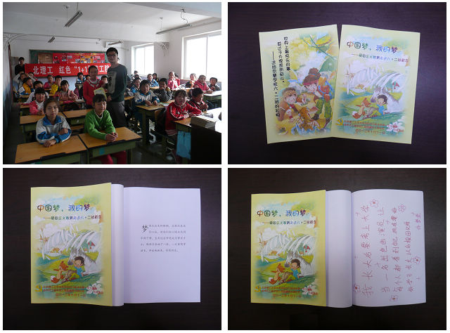 中午時分,兩支部大學生黨員到達了北京京蓼小學。京蓼小學位于京郊房山區(qū)良鄉(xiāng)肖莊村,是一所民辦打工子弟學校,辦學條件比較艱苦。兩支部大學生黨員首先為六年級2班的同學們送去了他們精心制作的《中國夢,我的夢》紀念冊,該紀念冊是上次支教活動結束后基于小學生們以文字、圖畫形式表達出來的“夢想”,加上兩支部大學生黨員的寄語與精美封面制作而成的。小學生們接過了紀念冊,一一傳看,在他們專注的眼神中,閃爍著對未來,對夢想的無限憧憬。