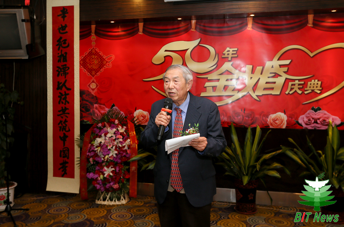 校黨委書記郭大成致賀詞,代表學(xué)校黨委向全體金婚伉儷表示崇高的敬意和衷心的祝賀!郭書記高度贊揚(yáng)了金婚伉儷們對美好生活的不懈追求和對甜蜜愛情的矢志不渝,引領(lǐng)了家庭和睦、代際和順、社會和諧的良好風(fēng)尚。他指出老一輩北理工人懷著對黨的教育事業(yè)的無限忠誠,辛勤付出,為學(xué)校又好又快的發(fā)展奠定了堅(jiān)實(shí)的基礎(chǔ)。在新時期,老同志們?nèi)詽M懷對學(xué)校炙熱的情感,在我校開展群眾路線教育實(shí)踐活動中,積極為學(xué)校發(fā)展建設(shè)建言獻(xiàn)策,奏響了老同志“共筑中國夢”的響亮號角,以老驥伏櫪志在千里的豪情老有所為,綻放出夕陽紅的壯麗光輝。在老同志們的支持、理解和幫助下,全校師生共同努力,必將迎來北京理工大學(xué)新的輝煌!