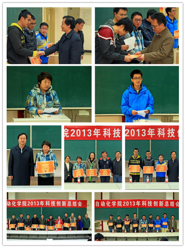 表彰決定宣讀完畢,校基金會(huì)主任羅雪、校工會(huì)副主席張百海為獲獎(jiǎng)的11名教師頒發(fā)創(chuàng)新指導(dǎo)獎(jiǎng);自動(dòng)化學(xué)院院長(zhǎng)、黨委書(shū)記王軍政教授為三組榮獲創(chuàng)新團(tuán)隊(duì)的團(tuán)隊(duì)代表頒發(fā)創(chuàng)新團(tuán)隊(duì)奉獻(xiàn)獎(jiǎng),并為獲得特殊奉獻(xiàn)獎(jiǎng)的教師頒獎(jiǎng);學(xué)院副院長(zhǎng)廖曉鐘、副院長(zhǎng)劉昕戈為6名獲得突出貢獻(xiàn)獎(jiǎng)的教師頒獎(jiǎng);自動(dòng)化學(xué)院副院長(zhǎng)劉向東為獲得特等獎(jiǎng)學(xué)金的16名學(xué)生頒獎(jiǎng)。隨后,獲獎(jiǎng)教師代表張婷老師以及獲獎(jiǎng)學(xué)生代表張立天同學(xué)分別發(fā)言,他們?cè)诎l(fā)言中分享了自己參與大學(xué)生科技創(chuàng)新工作的心得,并表示將在今后的工作和學(xué)習(xí)中再創(chuàng)佳績(jī)!
