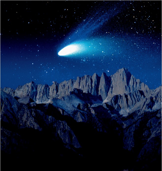 圖二:1997年,在加利福尼亞州西瓦內(nèi)華達(dá)山區(qū),“海爾-波普彗星”的霧化尾跡發(fā)出明亮的光,照亮了惠特尼地區(qū)層巒疊嶂的群山。