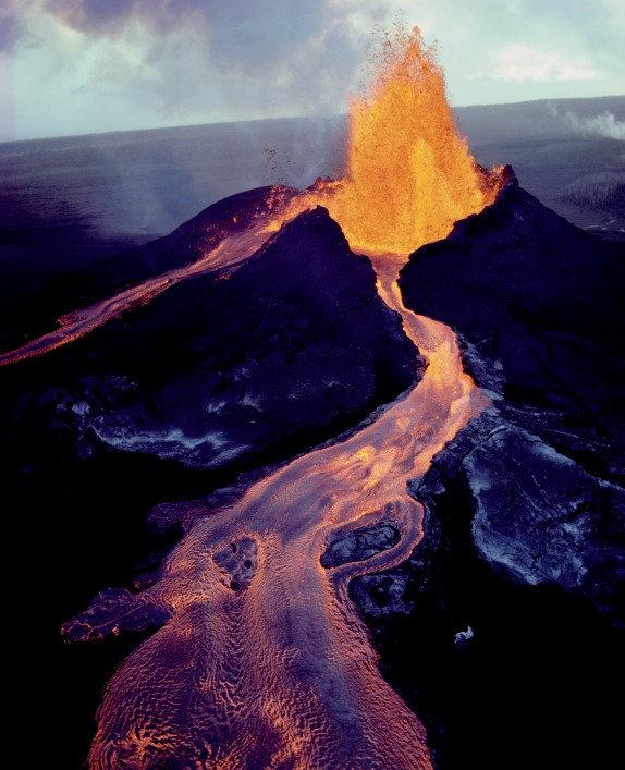 圖三:基拉韋厄火山的泄漏管道常常將熾熱的熔巖流注入海洋