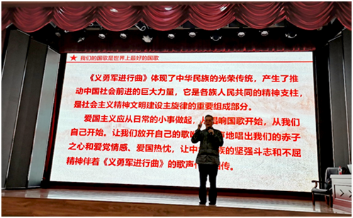 在講座中,于海指導同學們理解和感悟中華人民共和國國歌《義勇軍進行曲》激昂向上、鏗鏘有力的藝術(shù)特色,結(jié)合黨領(lǐng)導民族獨立解放的時代背景,為同學們講述了國歌中的愛國主義內(nèi)涵,堅定同學們堅定跟黨走的理想信念。在講座中,于海分享了香港回歸和利比亞撤僑中的國歌故事,幫助同學們充分理解國歌作為國家主權(quán)的聲音象征和精神符號的重要意義。