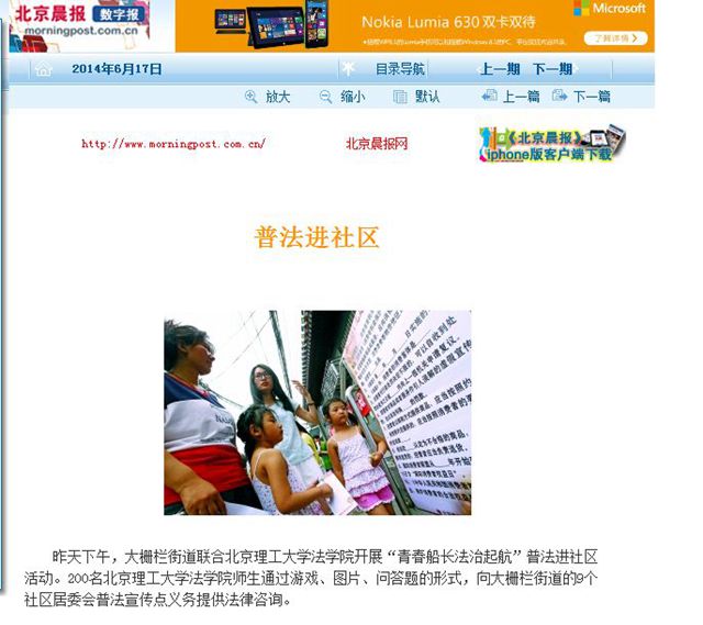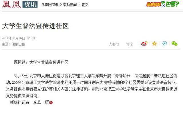 6月15日,北京理工大學(xué)法學(xué)院200余名師生黨員普法志愿者來到大柵欄街道開展系列普法宣傳活動(dòng),通過組織普法好聲音文藝演出、普法有獎(jiǎng)問答、法律咨詢等方式為胡同里的居民們送來法律知識(shí)和法律服務(wù)。新華社、中國(guó)政府網(wǎng)、科技日?qǐng)?bào)、鳳凰網(wǎng)、新浪網(wǎng)、中國(guó)網(wǎng)以及北京市教委官方微博等媒體先后發(fā)布或轉(zhuǎn)發(fā)了本次活動(dòng)的新聞報(bào)道。