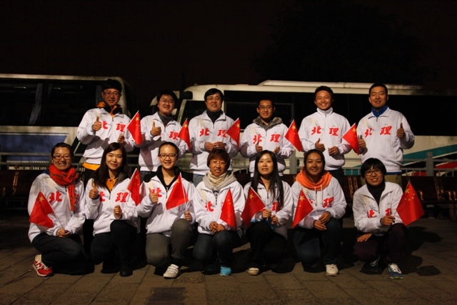 清秋凌晨的京城,已夾帶絲絲寒意。凌晨兩點,穿著統(tǒng)一白色服裝、胸前印著醒目“北理”二字的170名師生準(zhǔn)時在理工大學(xué)門口集合,由校團(tuán)委書記藺偉帶隊乘車前往那見證無數(shù)歷史性時刻的天安門廣場。凌晨的北京,秩序井然,給人一種莊嚴(yán)之感,一路上,車?yán)锒己馨察o,大家都在靜靜地看著,體味著,思考著,感動著——這是一種深沉的情感,是對六十五周年國慶的祝賀,是對祖國繁榮昌盛的禮贊,是為我們這樣一個偉大的國度而產(chǎn)生的深深自豪。