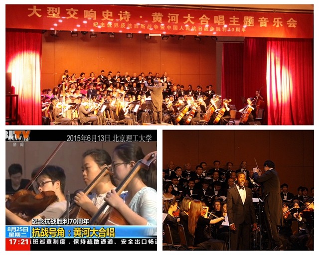 學(xué)校于6月13日晚在中關(guān)村校區(qū)文化劇場隆重舉行了交響史詩黃河大合唱——紀(jì)念中國人民抗日戰(zhàn)爭暨世界反法西斯勝利70周年主題音樂會。黨委副書記副校長項昌樂與數(shù)百名師生一起在音樂中緬懷先烈,共同紀(jì)念中國人民保家衛(wèi)國、爭取和平的光輝歷史。中央電視臺《新聞直播間》欄目對本次音樂會進(jìn)行了報道。音樂會中,我校交響樂團(tuán)、學(xué)生合唱團(tuán)演奏演唱了交響史詩《黃河大合唱》多個經(jīng)典選段,還與教工合唱團(tuán)一起演唱了《松花江上》等經(jīng)典愛國歌曲。