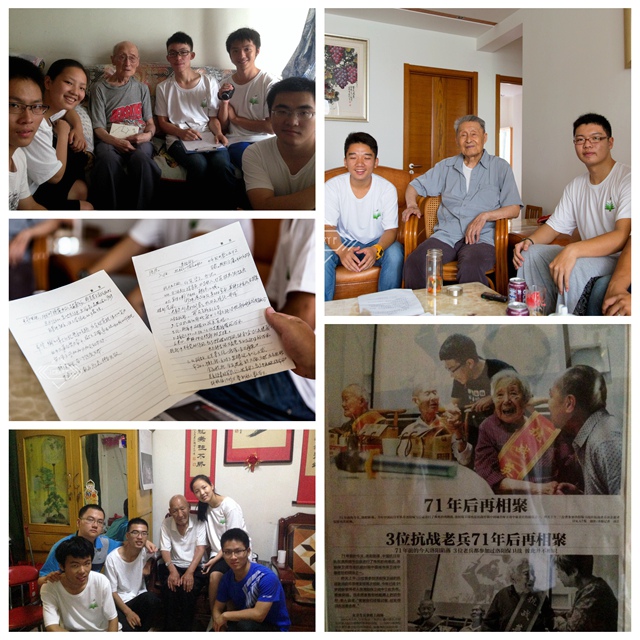 顏祿淼同學(xué)所在的實踐團隊,拜訪了許多昔日的抗日英雄——投筆從戎的葉于良老人,衛(wèi)生隊的張翠萍老人,微山湖游擊隊的政委孫新民老人等;曹文濤同學(xué)的實踐團隊,同樣對老兵給予了關(guān)注,拜訪了參加淞滬戰(zhàn)役等大戰(zhàn)的范希賢老人,羅啟忠老人等。