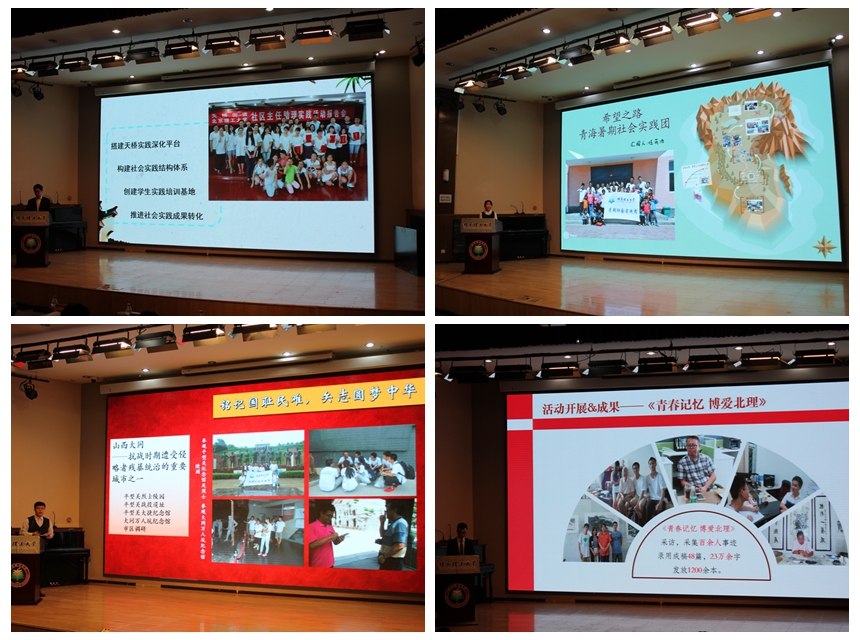 在成果展示環(huán)節(jié),北京理工大學(xué)社會(huì)實(shí)踐品牌團(tuán)隊(duì)和一等獎(jiǎng)團(tuán)隊(duì)代表分享了社會(huì)實(shí)踐的歷程和心得、經(jīng)驗(yàn)與收獲。社會(huì)調(diào)研類團(tuán)隊(duì)——人文與社會(huì)科學(xué)學(xué)院 “天橋大學(xué)生社區(qū)主任助理”實(shí)踐團(tuán),志愿公益類團(tuán)隊(duì)——機(jī)電學(xué)院“希望之路”青??破罩Ы虉F(tuán),體驗(yàn)觀察類團(tuán)隊(duì)——學(xué)生工作部“勿忘國(guó)恥·圓夢(mèng)中華”德學(xué)先鋒實(shí)踐團(tuán),人物訪談?lì)悎F(tuán)隊(duì)——教育基金會(huì)75周年獻(xiàn)禮之“北理記憶”捐資人訪談實(shí)踐團(tuán),通過(guò)PPT、視頻等方式,為大家奉獻(xiàn)了一場(chǎng)精彩的社會(huì)實(shí)踐報(bào)告會(huì),展示出了品牌團(tuán)隊(duì)扎實(shí)的工作基礎(chǔ)和日趨完善的工作體系。