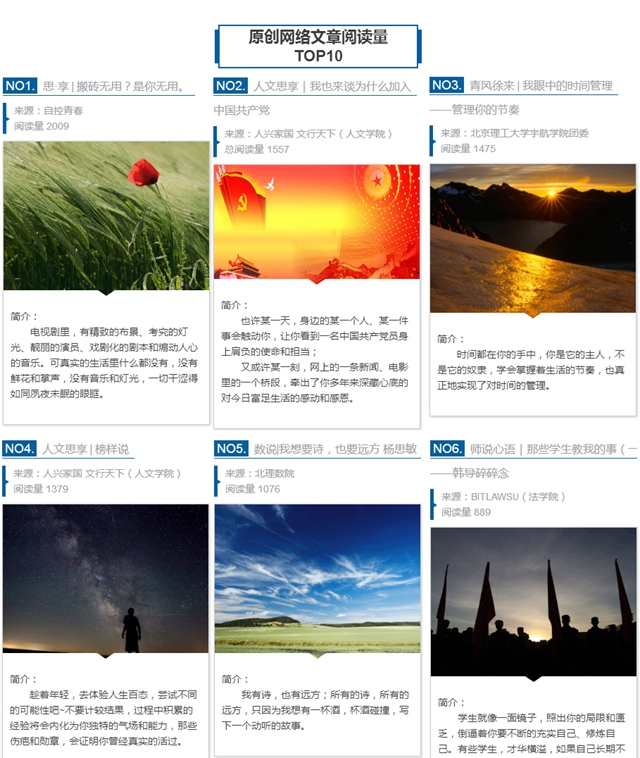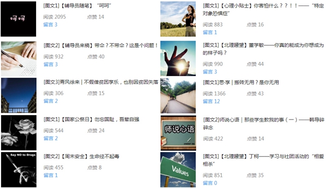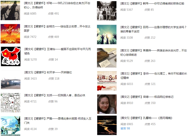 開展“瞭望杯”優(yōu)秀網(wǎng)絡文章大賽。2016年10月,學生工作處面向全校師生舉辦了“瞭望杯”2016年第1期優(yōu)秀網(wǎng)絡文章大賽。比賽涵蓋理想信念教育、愛國主義教育、思想道德建設等9個主題。收錄網(wǎng)絡文章共計400余篇,文字累積超過60萬字。在學生工作處微信公眾平臺推送的部分優(yōu)秀作品,閱讀量累計近15萬次。目前2016年第2期“瞭望杯”比賽正在進行中。