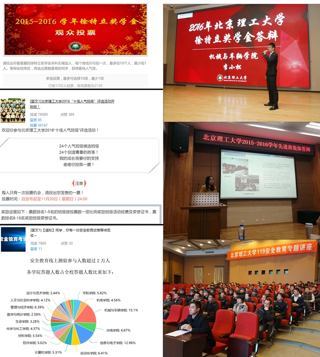 推動思想政治教育活動線下線上相結合。學生工作處在傳統(tǒng)的“優(yōu)秀班集體評選”活動中加入“十佳人氣班級”網(wǎng)絡評選環(huán)節(jié);在“徐特立獎學金答辯”活動中加入人物風采網(wǎng)絡宣傳及現(xiàn)場網(wǎng)絡投票環(huán)節(jié);在今年的安全教育環(huán)節(jié)中,學生工作處在傳統(tǒng)的安全講座的基礎上,面向全體在校生開展了安全教育在線考試,試題涵蓋學生學習、生活相關的多方面安全知識,一周內(nèi)參與考試人數(shù)超過2萬人,全校學生參與率90%以上,取得了良好的安全教育效果。