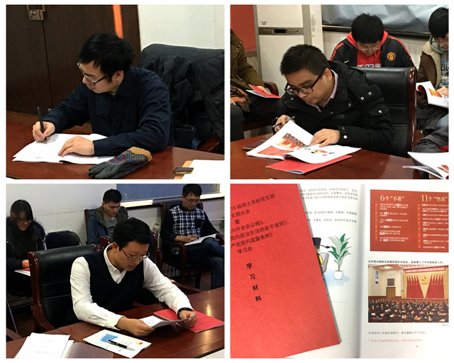 編輯:金林劍 審核:張宏亮 閱讀次數(shù):按照北理工黨委對“兩學(xué)一做”學(xué)習(xí)教育中召開專題組織生活會和開展民主評議黨員的具體要求,自動化學(xué)院博士系統(tǒng)黨支部、15級碩士系統(tǒng)黨支部于2016年12月28日上午,在六號樓三層會議室召開第一環(huán)節(jié)工作,集體學(xué)習(xí)習(xí)近平總書記在黨的十八屆六中全會和在全國高校思想政治工作會上的重要講話精神、《關(guān)于新形勢下黨內(nèi)政治生活的若干準(zhǔn)則》(以下簡稱《準(zhǔn)則》)和《中國共產(chǎn)黨黨內(nèi)監(jiān)督條例》(以下簡稱《條例》)。自動化學(xué)院院長助理、支部理論學(xué)習(xí)導(dǎo)師柴森春副教授,博士系統(tǒng)黨支部、15級碩士系統(tǒng)黨支部全體黨員參加了學(xué)習(xí)。本次會議由博士系統(tǒng)黨支部書記關(guān)子霄主持。