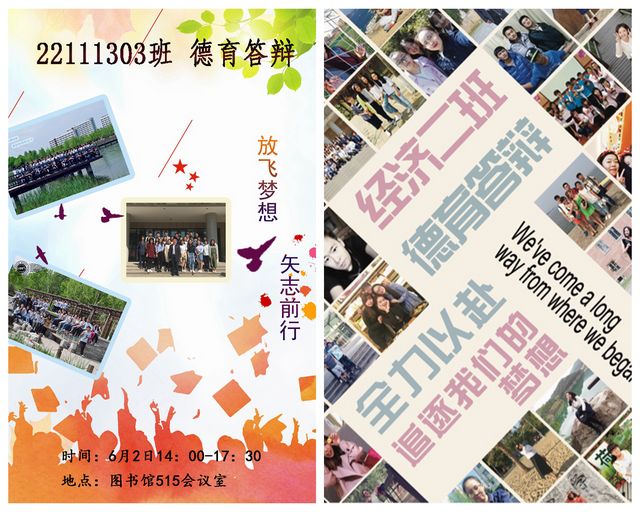22111301班的德育答辯主題為“青春不散”。同學(xué)們?cè)谡故局谢蚧仡櫵哪甏髮W(xué)生活,或分享保研、考研和找工作的經(jīng)歷,或憧憬未來(lái)美好的生活,或表達(dá)對(duì)老師、朋友、學(xué)院和學(xué)校的不舍。班主任陳秀梅老師對(duì)同學(xué)們的答辯內(nèi)容進(jìn)行了總結(jié),對(duì)未來(lái)同學(xué)們學(xué)習(xí)生活提出了努力不負(fù)青春的希望。22111302班的德育答辯主題為“全力以赴,追逐我們的夢(mèng)想”。人文學(xué)院黨委副書(shū)記李冰老師參與答辯,他結(jié)合自己的學(xué)習(xí)和工作經(jīng)歷與同學(xué)們交流了關(guān)于大學(xué)學(xué)習(xí)生活的感悟,表達(dá)對(duì)同學(xué)們的祝福。德育答辯中班級(jí)播放了同學(xué)們?cè)诖髮W(xué)各個(gè)時(shí)期的個(gè)人照和合影為線索的回顧視頻。個(gè)人展示環(huán)節(jié),同學(xué)們用各自的方式和言語(yǔ)表達(dá)對(duì)大學(xué)生活的感悟。班主任吳建民老師在總結(jié)中肯定了同學(xué)們四年的付出和成績(jī),也表達(dá)了他對(duì)同學(xué)們未來(lái)工作、學(xué)習(xí)和生活的祝愿。22111303班的德育答辯主題為“放飛夢(mèng)想,矢志前行”。答辯過(guò)程中播放了由經(jīng)濟(jì)三班集體活動(dòng)的照片制作而成的視頻,反映了大家的精彩大學(xué)生活。同學(xué)們追憶往昔、展望未來(lái),答辯會(huì)在溫馨和睦的氛圍中進(jìn)行。最后班主任張雷老師肯定同學(xué)們做到了德育開(kāi)題時(shí)其對(duì)同學(xué)們提出的兩個(gè)“成”——心智成熟,專業(yè)成長(zhǎng),并期待同學(xué)們?cè)谖磥?lái)實(shí)現(xiàn)第三個(gè)“成”——領(lǐng)域成功。22121301社會(huì)工作班的德育答辯同學(xué)們從照片中回憶往昔,在分享中暢談未來(lái)。一部分同學(xué)講述了自己與其他同學(xué)之間的友情,回顧一起走過(guò)的歲月;一部分同學(xué)分享了自己的收獲:知識(shí)、經(jīng)驗(yàn)、一份夢(mèng)想成真,讓在場(chǎng)同學(xué)體味到匆匆時(shí)光中的苦辣酸甜;還有部分同學(xué)表達(dá)了對(duì)老師諄諄教誨的感謝,對(duì)同窗苦樂(lè)相伴的感謝。輔導(dǎo)員孫碩在點(diǎn)評(píng)中肯定了班級(jí)同學(xué)積極向上和團(tuán)結(jié)協(xié)作的精神。最后,班主任鄭佳然老師對(duì)同學(xué)的答辯進(jìn)行了點(diǎn)評(píng),并贈(zèng)送了親手制作的小禮物。