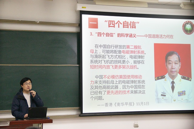 藺偉從“四個(gè)自信的提出”“中國(guó)特色社會(huì)主義”“四個(gè)自信的科學(xué)含義”三個(gè)方面對(duì)“四個(gè)自信”進(jìn)行深入講解。通過(guò)對(duì)中國(guó)特色社會(huì)主義歷程各個(gè)階段的深入分析,剖析了其特有的歷史必然性和優(yōu)越性,通過(guò)生動(dòng)貼切的視頻講解和準(zhǔn)確的數(shù)據(jù),向同學(xué)們展示了中國(guó)共產(chǎn)黨的歷史新變革,表達(dá)了對(duì)未來(lái)的展望。