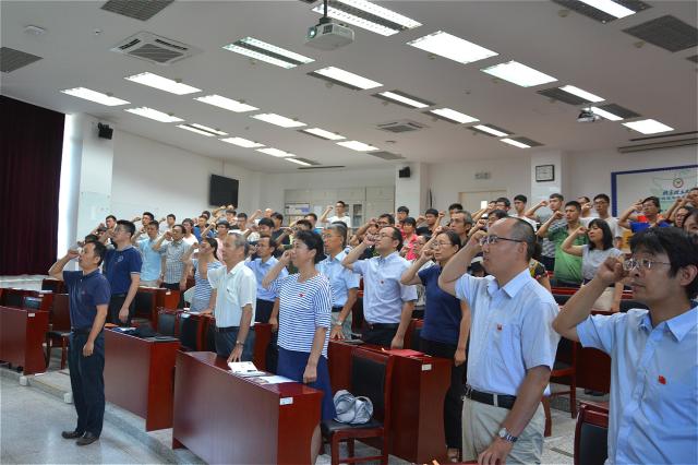 會(huì)議最后,預(yù)備黨員面對(duì)黨旗進(jìn)行入黨宣誓,參會(huì)黨員同時(shí)重溫入黨誓詞。