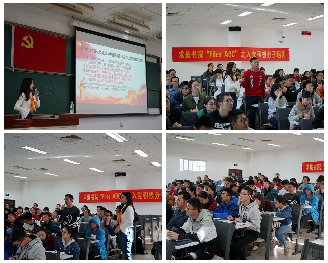 為教育引導(dǎo)學(xué)生樹立共產(chǎn)主義遠(yuǎn)大理想和中國(guó)特色社會(huì)主義共同理想,增強(qiáng)學(xué)生的中國(guó)特色社會(huì)主義道路自信、理論自信、制度自信、文化自信,立志肩負(fù)起民族復(fù)興的時(shí)代重任,求是書院“Files ABC”之第一期入黨積極分子培訓(xùn)班于11月18日在理科教學(xué)樓402室開班,經(jīng)個(gè)人提交入黨志愿書申請(qǐng)、接受組織談話、團(tuán)支部推薦等程序產(chǎn)生的90名入黨積極分子參加了本期培訓(xùn)。