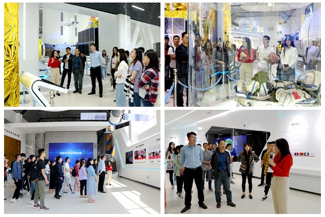 隨后,師生們跟隨工作人員共同參觀了導航定位、通信廣播、對地觀測、空間科學與技術(shù)試驗、深空探測、載人航天六大系列航天器模型和部分實物,近距離地看到了媒體報道中的人造衛(wèi)星、發(fā)射器、地面站系統(tǒng)等。一張張圖片、一件件模型與實物,展示了航空技術(shù)在衛(wèi)星通信傳輸、氣象服務(wù)、農(nóng)業(yè)育種等領(lǐng)域的廣泛應(yīng)用。盡管短時間內(nèi)很難全面了解專業(yè)高精設(shè)備中的奧秘,但師生們真切體會了航天技術(shù)的復雜與精細,震撼、驚嘆于我國航天事業(yè)的重大科技成就,為祖國倍感自豪。