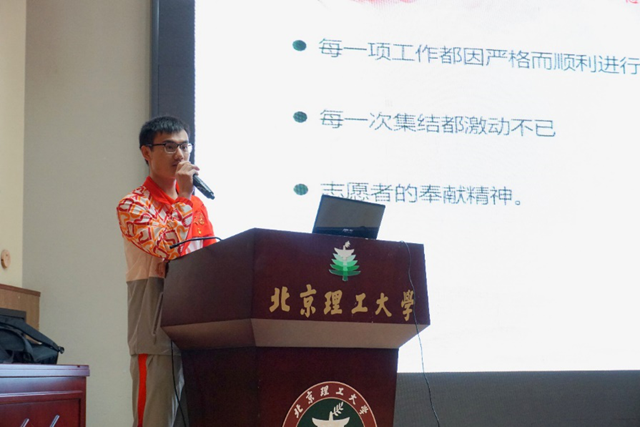 餐包服務(wù)志愿者代表、材料學(xué)院兼職輔導(dǎo)員蔡懷建講述了他的親身經(jīng)歷,他從“我們是誰(shuí)”“我們做了什么”“我們?cè)趺醋龅母谩焙汀拔覀兊母邢肱c收獲”四個(gè)方面展現(xiàn)了他們作為餐包服務(wù)志愿者的工作,從視頻培訓(xùn)到實(shí)地演練,為了在國(guó)慶當(dāng)天有更好、更高效率的表現(xiàn),餐包服務(wù)志愿者們認(rèn)真訓(xùn)練、不怕苦累,在實(shí)戰(zhàn)中磨練,在演練中提升,最終圓滿完成保障補(bǔ)給任務(wù)。