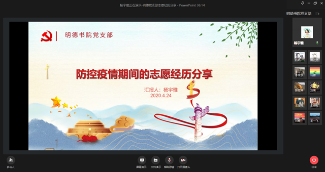 為深入學(xué)習(xí)貫徹習(xí)近平總書記重要回信精神,持續(xù)推進(jìn)新時(shí)代愛(ài)國(guó)主義教育,積極響應(yīng)“擔(dān)復(fù)興大任,做時(shí)代新人”主題教育活動(dòng)號(hào)召,教育引導(dǎo)廣大青年黨員將習(xí)近平總書記回信精神作為人生指引,以實(shí)際行動(dòng)升華學(xué)習(xí)成果、篤行強(qiáng)國(guó)使命,4月24日,明德書院黨支部開(kāi)展“共學(xué)回信精神,同擔(dān)時(shí)代大任”線上主題黨日活動(dòng),支部全體黨員參加了此次活動(dòng)?;顒?dòng)主要分為學(xué)習(xí)習(xí)近平總書記回信,分享個(gè)人抗“疫”故事以及主題討論三個(gè)部分。黨員們學(xué)習(xí)理論、交流想法、暢所欲言,收獲頗豐。
