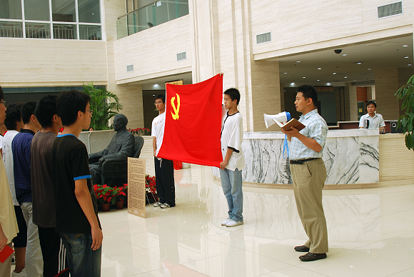 王悅音書(shū)記在講話中首先祝賀了全體新發(fā)展黨員,指出入黨宣誓是每名黨員必經(jīng)的一個(gè)環(huán)節(jié)和儀式,學(xué)院此次在徐特立先生銅像前組織宣誓活動(dòng)就是要讓大家銘記黨員身份,以此為起點(diǎn)不斷提高黨性修養(yǎng),并希望全體新黨員在學(xué)習(xí)、生活和工作的方方面面都要做到高標(biāo)準(zhǔn)、嚴(yán)要求,特別是在即將到來(lái)的07級(jí)學(xué)生搬遷過(guò)程中積極主動(dòng),發(fā)揮先鋒模范和帶頭作用,共同做好搬遷相關(guān)各項(xiàng)工作。