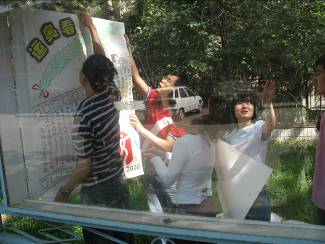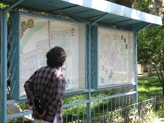 為了深入貫徹學(xué)院分黨委“黨員零距離”系列活動(dòng)的精神,5月20號(hào)上午,我院04級(jí)二支部黨員來到學(xué)校家屬區(qū),為理工家屬區(qū)的板報(bào)換新顏。以?shī)W運(yùn)為主題的板報(bào)板面活潑,鮮艷的色彩洋溢著青春的氣息,不禁引來過往行人的駐足。